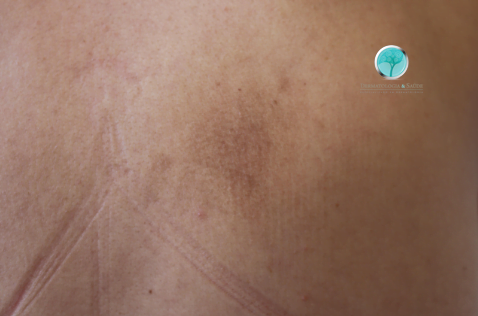 amiloidose macular – mancha marrom escura de aparência ondulada entre as escápulas