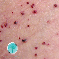 Doença de Fabry – Lesões de pele Vamos falar um pouco mais sobre as lesões de pele. ANGIOQUERATOMAS :Inúmeras bolinhas cor de sangue, bem pequenas