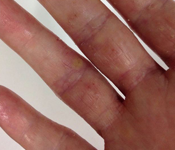 Pode iniciar apenas como ressecamento. Com a continuidade da exposição ao agente irritante, o quadro pode evoluir para vermelhidão, descamação e até fissuras dolorosas, muitas vezes impedindo o paciente de trabalhar e até mesmo continuar a exercer sua profissão. Quando a dermatite ocorre por muitos anos, as marcas da impressão digital podem se apagar.