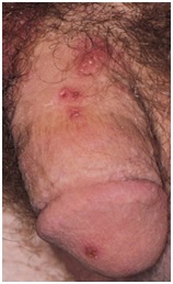 As lesões do herpes simples (HSV 2) são de transmissão sexual (DST). A primeira infecção ocorre normalmente em adultos jovens e as lesões aparecem normalmente ao redor dos genitais, região anal e nádegas.