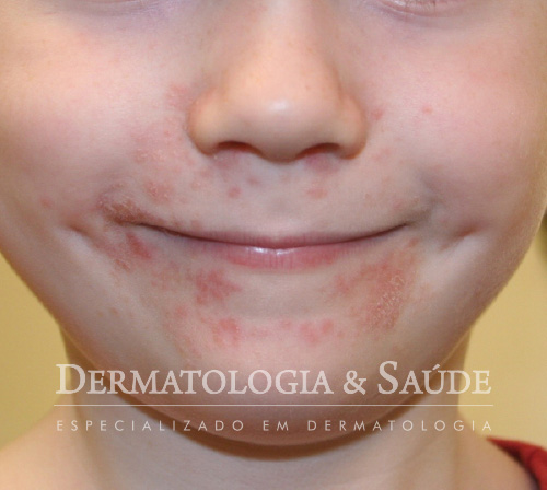 - Pele avermelhada e irritada, principalmente no sulco nasogeniano (bigode chinês);